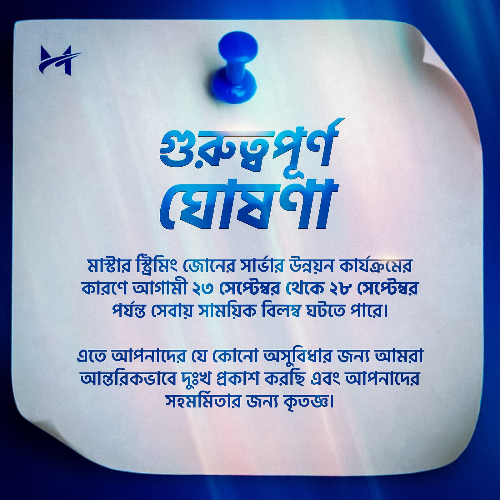 ⚠️Important Notice⚠️ 📢 গুরুত্বপূর্ণ ঘোষণা মাস্টার স্ট্রিমিং জোনের সার্ভার উন্নয়ন কার্যক্রমের কারণে আগামী ২৩ সেপ্টেম্বর থেকে ২৮ সেপ্টেম্বর পর্যন্ত সেবায় সাময়িক বিলম্ব ঘটতে পারে। এতে আপনাদের যে কোনো অসুবিধার জন্য আমরা আন্তরিকভাবে দুঃখ প্রকাশ করছি এবং আপনাদের সহযোগিতার জন্য কৃতজ্ঞ। — Master Streaming Zone Continue Shopping