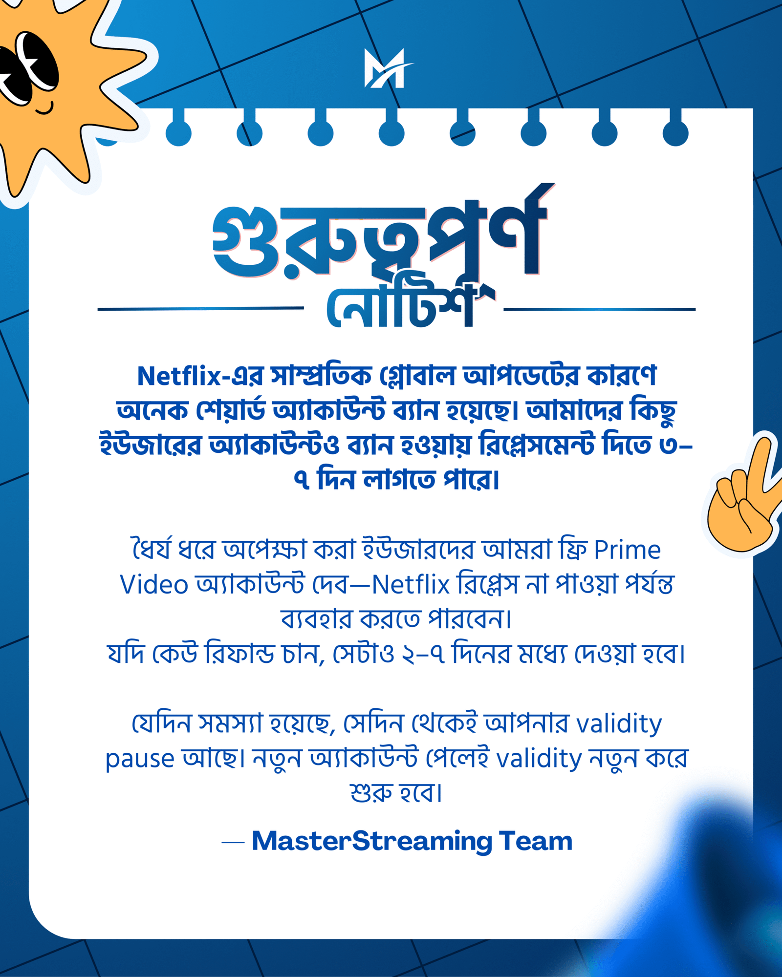 সম্প্রতি Netflix তাদের গ্লোবাল সিকিউরিটি আপডেটের কারণে বিভিন্ন দেশের অনেক শেয়ার্ড অ্যাকাউন্ট হঠাৎ করে ব্যান করে দিচ্ছে। গত ২ দিনে আমাদের পক্ষ থেকেও বেশ কিছু অ্যাকাউন্ট Netflix কর্তৃপক্ষ ব্যান করেছে।